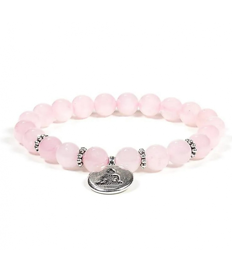 Dieses Armband besteht aus 21 Rosenquarzperlen und einem Buddha-Symbol.