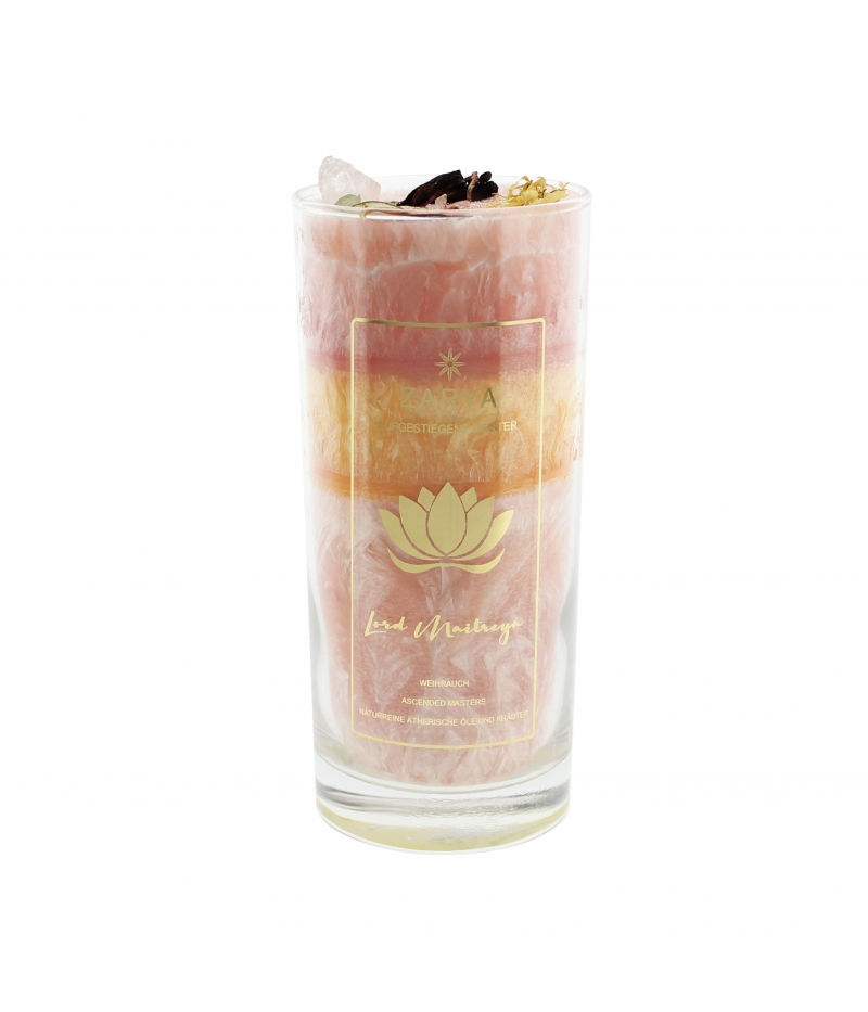Diese hochwertige Ritualkerze des aufgestiegenen Meisters ist aus 100% pflanzlichen Stearin (kbA) mit naturreinen ätherischen Ölen, einem natürlichen Holzdocht, echten Edelsteinen und Bio-Pflanzenmischungen, in liebevoller Handarbeit in Deutschland gefertigt. Sie ist behutsam in Seidenpapier eingewickelt und in einer edlen schwarzen Verpackung erhältlich.