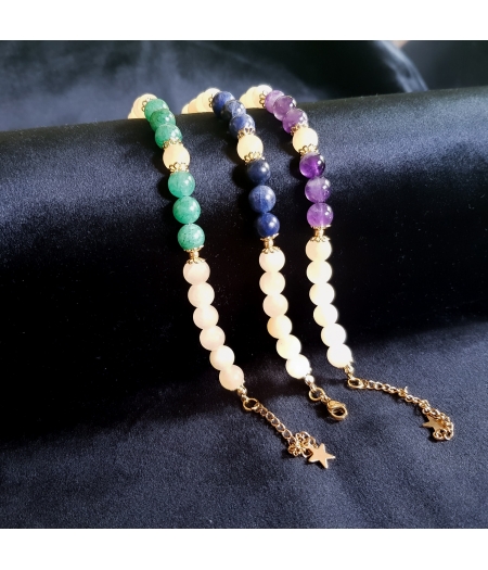 Gemeinsam helfen dir die Edelsteine, Ordnung in deine Gedanken zu bringen, Achtsamkeit zu kultivieren und neue Impulse mit Klarheit zu erfassen. Die goldenen Verzierungselemente verleihen dem Armband eine ruhige Eleganz, die deine spirituelle Praxis auf ästhetische Weise begleitet.