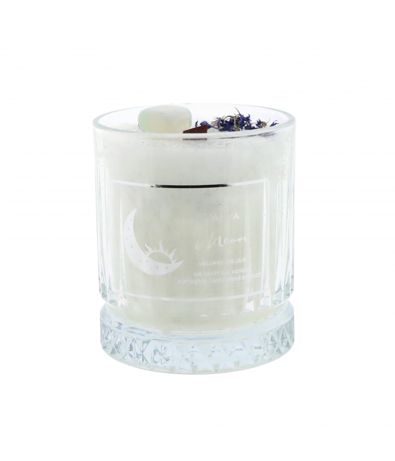 Diese hochwertige Duftkerze ist, aus 100% pflanzlichen Stearin (kbA) mit naturreinen ätherischen Ölen, Pflanzenmischungen, einem natürlichen Holzdocht und einem echten Edelsteinanhänger, in liebevoller Handarbeit in Deutschland, angefertigt. Für die Mondkerze wird die ihr entsprechenden Öle und Edelsteine verwendet, um dessen lunare Kraft zu unterstützen. Sie ist behutsam in Seidenpapier eingewickelt und in einer edlen schwarzen Geschenkverpackung mit silbernem Etikett erhältlich.