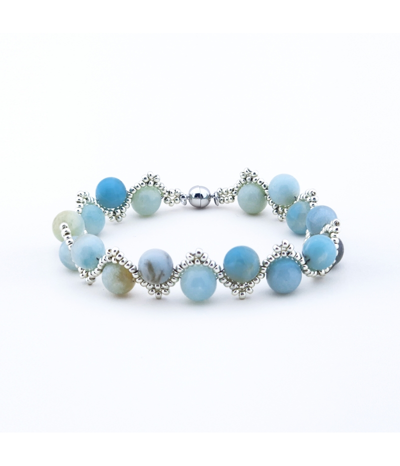 Der Amazonit, bekannt für seine beruhigende und ausgleichende Wirkung, fördert auf der spirituellen Ebene Wachstum, inneren Fortschritt und die Fähigkeit, klare Entscheidungen zu treffen. Seine Energie unterstützt dabei, sich mutig neuen Vorhaben zu widmen und die eigenen Ziele entschlossen zu verfolgen, während die silbernen Rocailles Perlen Eleganz und Raffinesse verleihen.