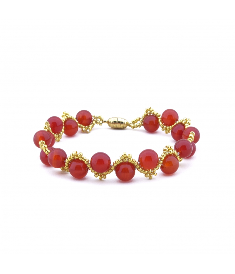 Der Karneol bekannt für seine vitalisierende und motivierende Wirkung, hilft auf der spirituellen Ebene, Sachverhalte zu erkennen, wahre Gefühle zu verstehen und Klarheit in die eigenen Gedanken, Wünsche und Ziele zu bringen. Seine Energie unterstützt dabei, sich mit den eigenen Emotionen auseinanderzusetzen und Harmonie zu finden, während die goldenen Rocailles Perlen Eleganz und Raffinesse verleihen.