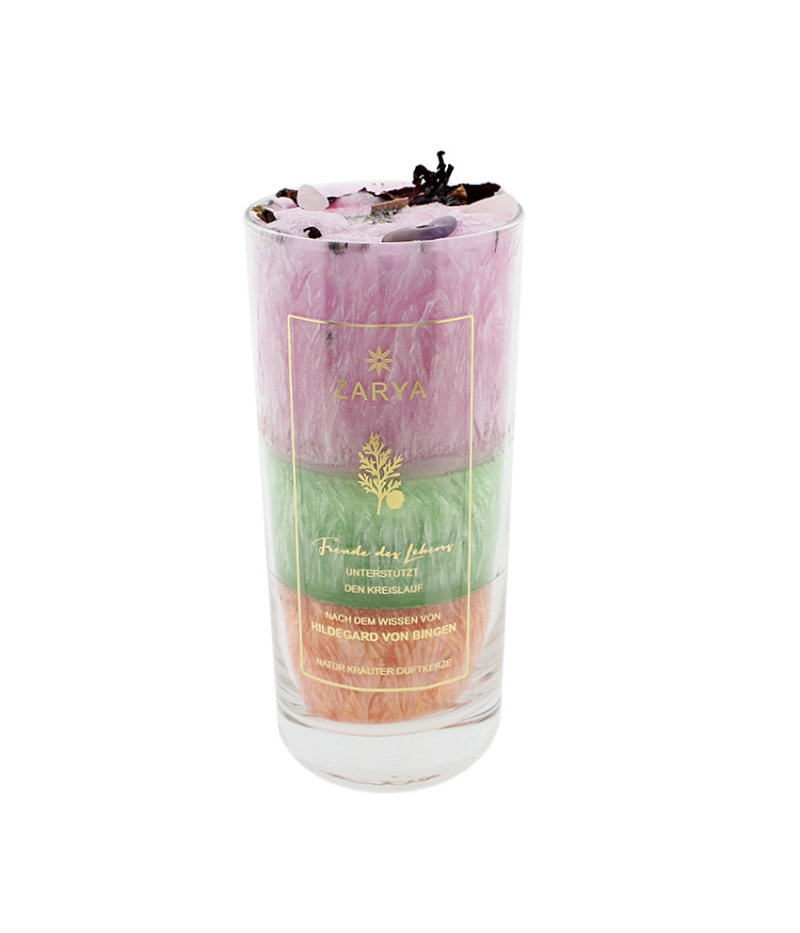 Diese Heilkräuterkerze vereint das Wissen der Hildegard von Bingen, die Heilsteine der Organuhr und die Prinzipien der Aromatherapie. Durch das Anzünden dieser Ritualkerze wird die die Lebensfreude und auch gleichzeitig „der Kreislauf“ unterstützt.
