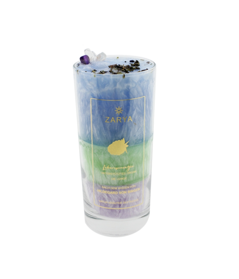 Diese Heilkräuterkerze vereint das Wissen der Hildegard von Bingen, die Heilsteine der Organuhr und die Prinzipien der Aromatherapie. Durch das Anzünden dieser Ritualkerze wird die eigene Lebensenergie und auch gleichzeitig „die Lunge“ unterstützt.