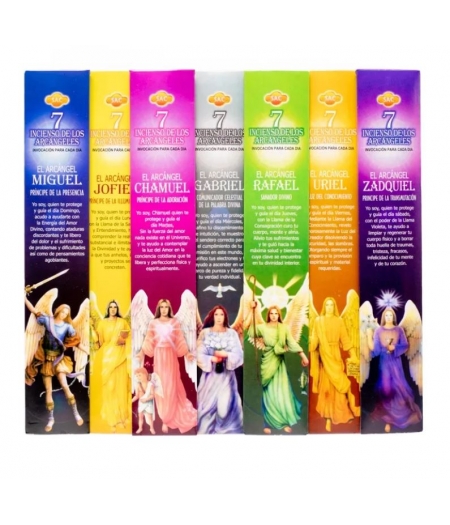 Sieben verschiedene Erzengel-Räucherstäbchensorten in einer Packung. Die Packung enthält sieben Päckchen der jeweiligen Erzengel: Michael, Gabriel, Raphael, Jophiel, Chamuel, Haniel und Zadkiel. Da auch jeder Erzengel seinen eigenen Duft hat, verhelfen die Räucherstäbchen dabei noch besser Kontakt zu dem jeweiligen Erzengel aufzubauen oder geben zusätzlich Unterstützung bei Ritualen.