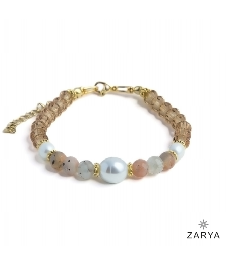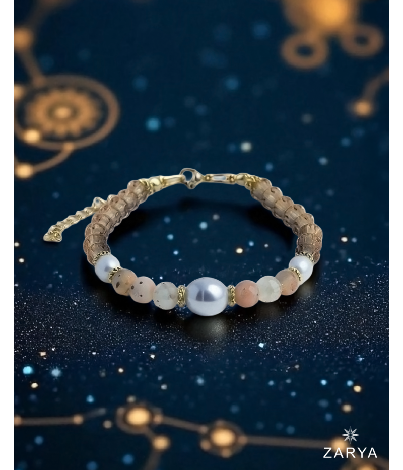 Dieses handgefertigte Edelstein-Armband, inspiriert von der tiefen, intuitiven Energie des Sternzeichens Krebs, vereint die sanfte Kraft der Süßwasserperlen mit der mystischen Ausstrahlung des facettierten Mondsteins und dem warmen Glanz der Light Topaz Preciosa Kristalle. Vergoldete Zwischenelemente und Miyuki Rocailles Perlen runden das Design mit zarter Eleganz ab.